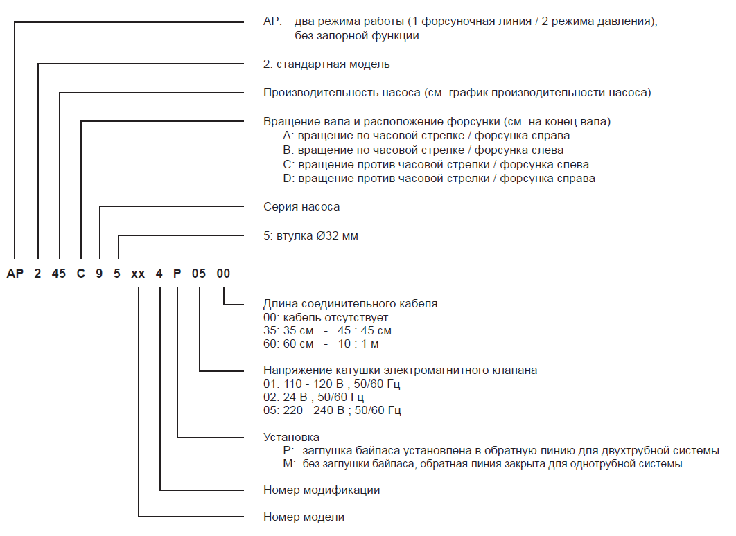 | Диапазон давления на форсунку | Низкое давление: 8-15 бар Высокое давление: 12-25 бар AP2 75/95: давление обеспечивается с форсункой 12,0 гал/ч (Другие диапазоны возможны по запросу при предоставлении характеристик насоса) |