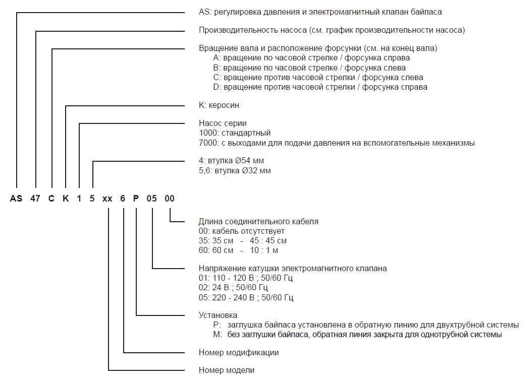 | Диапазон давления на форсунку | AS 47/47K/57/57K 7-14 бар AS 67/67K 10-15 бар (Другие диапазоны возможны по запросу при предоставлении характеристик насоса) |