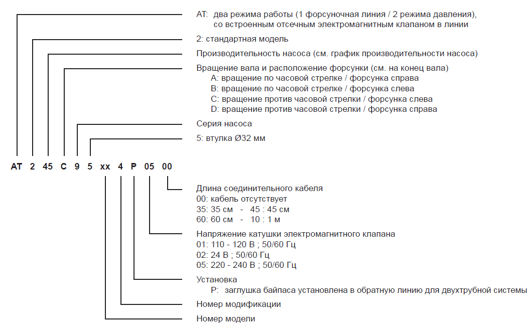 | Диапазон давления на форсунку | Низкое давление: 8-15 бар Высокое давление: 12-25 бар AT2 75/95: давление обеспечивается форсункой 12,0 гал/ч (Другие диапазоны возможны по запросу при предоставлении характеристик насоса) |