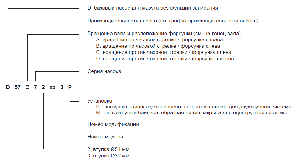 Вследствие наличия перепускного отверстия муфты форсуночной линии, насос не имеет запорной функции. Запорная функция должна обеспечиваться внешним электромагнитным клапаном. Модели типоразмера «45» и «55» имеют поршень со специальной полостью, чтобы избежать нарастания давления в форсуночной и всасывающей линии во время остановки насоса вследствие расширения топлива, нагреваемого подогревателем форсуночной линии.